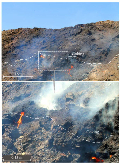 The activated zone (AZ) is black and consists of solid activated hydrocarbon products of pyrolysis, including fragments of wood modified into charcoal. Most parts of this zone are represented by fragments of coal caked in the form of coal-bearing semi-coke or transformed into heavy fractured coal with bright anthracite lustre (Figure 4). Pyrolysis gases, passing through this zone, colour all the debris of rocks in black. The thickness of the AZ changes over the range of 1.4–2.8 m. The average temperature of rocks is approximately 50 °C, and its fixed maximum does not exceed 63 °C.