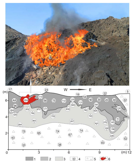 We managed to make a clearing of the current fire source in the zone of high-temperature pyrolysis and identify the pyrolysis zonal sequence in its section (Figure 6 and Figure 7). It has been established that its heating (focal) area is much larger than the same zones under low-temperature pyrolysis, and reaches more than 3.5 m. Statistical analysis of temperature measurement results in this zone showed that its average value is 790 °C, and recorded maximum temperature reaches 854 °C. The size of the activated zone is substantially reduced, moreover in some places this zone is missing, and there is a slow high-temperature combustion of the rock mass at the contact with the pyrolysis products of enriched zone. In the places of oxygen access, pyrolysis products inflammation and open combustion of rocks are observed. The average temperature of the rocks in the activated zone is 230 °C, and its fixed maximum temperature is 264 °C. Under natural high-temperature pyrolysis, the basement of the enriched zone is extremely wavy, and the thickness of the zone reaches four meters. The average temperature of hydrocarbon products in this zone is 60 °C, and near to the basement its maximum value reaches 177 °C. It is observed that the closer to the surface of the enriched zone, the lower temperature of the rock is. Every ten centimeters, the temperature drops by 12 °C sharply, and the average temperature of the ground surface is 20 °C.