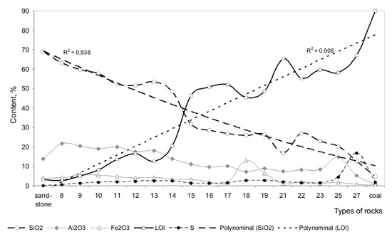 In conclusion, it is worth emphasizing that the numerous conducted chemical analyses of metamorphically modified rocks under pyrolysis showed that the metamorphic rocks are close to unaltered protolith sandstones and protolith coals are similar to the rocks of the pyrolysis enriched zone in their composition. In the performance of the silicate analysis, the entire mass of organic pyrolysis products burnt down, changing over to loss on ignition. Therefore, it was found that under natural pyrolysis, the distribution of the silica in different rocks of pyrolysis zones is inversely proportional to the amount of the pyrolysis products that is clearly confirmed by their polynominal curves (Figure 8).