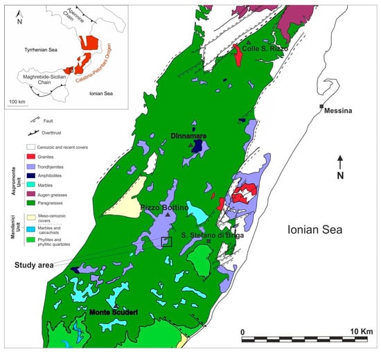 The Peloritani Mountains consist of a set of south-verging basement nappes with metamorphic grade increasing upwards, and remnants of Meso-Cenozoic unmetamorphosed and metamorphosed sedimentary covers [,]. The belt is subdivided into two complexes with different tectono-metamorphic histories [,]. The Lower Complex, in southern Peloritani, consists of sub-greenschist facies Cambrian to Carboniferous volcano-sedimentary sequences with unmetamorphosed Mesozoic sedimentary sequences [,,]. The Upper Complex, in the north-eastern sector, consists of two tectonic units, both characterized by clockwise P–T paths: 1) the Mandanici Unit, consisting of greenschist to lower amphibolite facies phyllites and minor phyllitic quartzites, with interbedded layers of metabasites and subordinate marbles and calc-schists [,], and 2) the overlying Aspromonte Unit, also cropping out in the adjacent Aspromonte Massif, which consists of amphibolite facies paragneisses, augen gneisses and migmatites, with minor marbles and amphibolites, locally intruded by late Variscan granitoid plutons [,,,,,,,,]. Both granitoids and host rocks are locally affected by an Alpine overprint which produced pseudotachylites and cataclastic to mylonitic rocks, as well as retrograde greenschist facies mineralogical assemblages ([] and references therein).