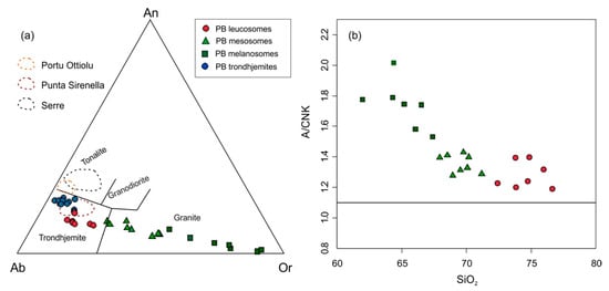 (a) Distribution of the Pizzo Bottino (PB) leucosomes, mesosomes and melanosomes in the feldspar CIPW-normative diagram []. Trondhjemites from the Pizzo Bottino Pluton (PB trondhjemites; []) are also reported in the diagram, as well as the compositions of trondhjemitic leucosomes from late Variscan metasedimentary migmatites from southern Italy (Serre Massif, Calabria, []; Punta Sirenella, Sardinia, []; Portu Ottiolu, Sardinia, []); (b) Distribution of studied samples in the A/CNK vs. SiO2 diagram.