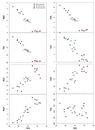 Local evidence of the crystallization of secondary plagioclase at the expense of original microcline is found in the Kfs-bearing micro-domains of some leucosomes, as documented for metasomatic trondhjemitic rocks in north-eastern Peloritani ([] and references therein). Nevertheless, the low amounts of this secondary plagioclase in the studied leucosomes only implies limited enhancing of already-trondhjemitic magmatic compositions. Therefore, the petrographic features of the studied leucosomes indicate a dominant origin by crystallization of a trondhjemitic melt.
