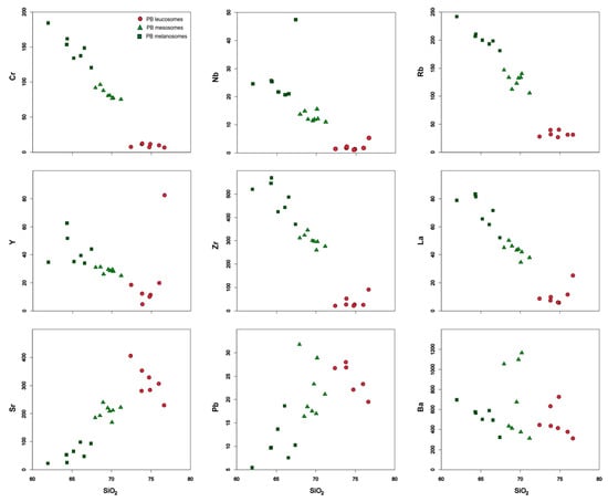 Correlations with silica are positive for Al2O3, Na2O, CaO, Sr and Pb, unclear for P2O5 and Ba, and negative for all the other elements. In most cases, trends are nearly collinear and continuous from melanosomes to mesosomes. They show continuity, also including the leucosomes, in the K2O, Na2O, CaO, Sr and Y vs. SiO2 diagrams. On the other hand, large gaps exist between mesosomes and leucosomes in the other diagrams because of the very low contents of Rb, LREE, HFSE and elements hosted by mafic phases in the latter.