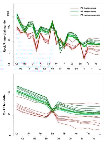 Primitive mantle-normalized trace element patterns and chondrite-normalized rare earth element (REE) patterns for the studied migmatitic rocks. Normalization values are from Sun and McDonough (1989) [] for primitive mantle and from Boynton (1984) [] for chondrite.