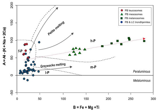 The low mafic contents typical of pure melts of the studied leucosomes are efficiently visualized in the modified B–A plot [] (Figure 8), where the samples plot in the field of the “highly felsic peraluminous granitoids” (fP). These granitoids have compositions representative of pure melts produced at low temperature by low-degree melting (< 20 %, for Fe + Mg + Ti < 50) of a variety of crustal sources. In fact, as reported by Villaseca et al. (1998) [], all the melts produced at low melting fractions of crustal rocks such as metapelites, metagreywackes, metadacites and amphibolites plot in the fP field of the diagram, irrespective of the nature of the source rocks. These melt compositions usually have no clear variation trends or, in some cases, vertical trends, but with a tendency of the pelite-derived melts to plot in the upper part of the field. In the B-A diagram [], the studied leucosomes plot in the upper part of the fP field, together with a few samples of the trondhjemites from the Pizzo Bottino and Forte Cavalli plutons, plotted for comparison [], while the majority of the plutonic trondhjemites plot along the trend defined by progressive melting of metagreywackes. This is consistent with an origin of the leucosomes by the partial melting of metapelites, or of metagreywackes with a higher proportion of pelitic matrix than the source rocks of the plutonic trondhjemites, which is supported by the trend depicted by the studied mesosomes and melanosomes across the highly peraluminous field of the B-A diagram. Derivation from a pelite-rich source might therefore explain the lower CaO contents of the studied leucosomes compared with the bulk of the peloritanian plutonic trondhjemites.