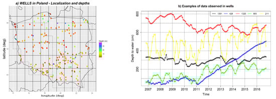 For validation, a groundwater level from measurement wells was taken. In situ measurements are carried out by the National Hydrogeological Service (Polish abbreviation: PSH). The PSH provides groundwater measurements of water quantity and quality, fulfilling the necessity of assessing the quantitative and chemical status of groundwater. Groundwater monitoring is very important in terms of water resource management and protection. Over 2000 measurement wells are located in the area of Poland. Monitoring of wells is carried out at different time scales, depending on their function. The water table measurement is performed every day at the first order hydrogeological stations; and once a week at the second order hydrogeological stations. In some of the first and second order hydrogeological stations, automatic measurements of the groundwater level were introduced. Diagnostic monitoring takes place every three years and covers the entire country. In the years between diagnostic monitoring, operational monitoring is carried out, during which uniform parts are sampled once or twice a year, threatened by failure to achieve good condition in the perspective of 2021 [].