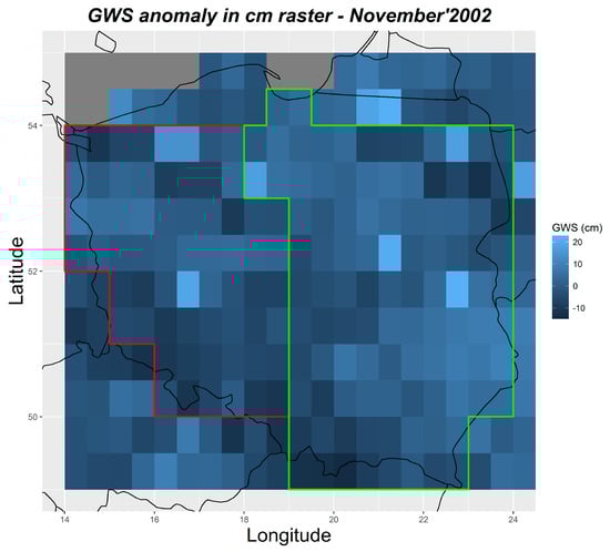 The JPL mascon data are given with the resolution of 0.5° in cm of equivalent water height. In the calculations, data given monthly, for the period from November 2006 to October 2016 were used. Missing epochs were completed by linear interpolation using the “approx” function of R []. This procedure gave 120 epochs (months) of monthly data, referenced to the 15th day of each month. All of the GRACE data were optimized to reduce the leakage effect, using scaling factors given together with the mascon JPL data. It should be noted that GRACE data are given in the form of anomalies in relation to the average value obtained in the period from January 2004 to December 2009. Any other period can be used to calculate the anomaly. In this paper we changed the period against which anomalies were calculated for January 2007 to December 2012. This was due to the fact that we used data for the wells for the period November 2006 to October 2016. Conversion to an anomaly relative to the average of another period is very simple and involves subtracting the new average from all previous anomaly values.