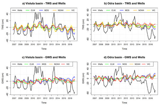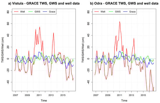 Polish wells are very diversified, both due to the depth of the water surface and seasonal changes in level. Figure 1b shows some examples of the anomalies of the unconfined water level of chosen wells taken for calculations. Two wells were removed from the calculations, due to unusual behavior, like the well 428. It can be seen that depth variations of individual well levels differed significantly between each other. However, the calculated average variations for the Vistula and Oder basins were similar, see Figure 3. These resulting averages were adopted for comparisons with GWS and TWS in further parts of the paper. Let us remind that TWS stands for GRACE derived total water storage, while GWS stands for ground water storage computed based on TWS and GLDAS data, see Equation (1) below.