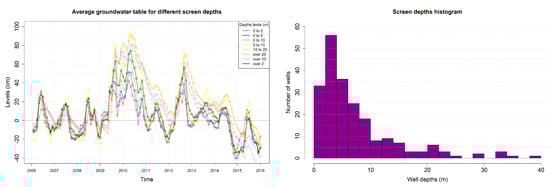 It can be seen from Figure 4a that time series of average thickness of the unsaturated zone at the location of the well changes for different depths were not shifted significantly. For example, the correlation coefficient calculated for wells up to 2 m deep and deeper than 2 m was 0.88. The maximum of CCF for these two groups of wells occurred at lag = −1 and was equal to 0.89. It suggests a very slight shift between the two time series, probably smaller than one month, and the direction of the shift was logical: deeper wells were delayed relative to shallower ones. The delay was probably less than one month.