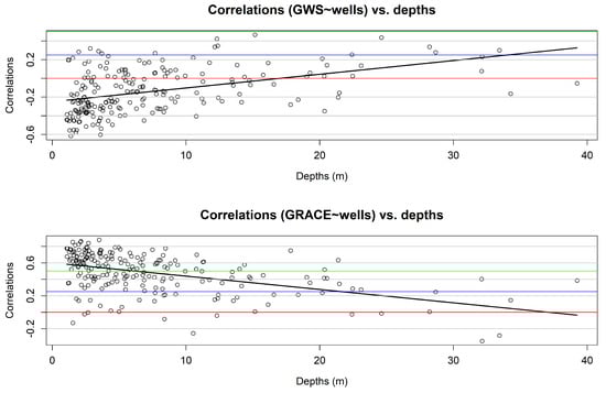 From Figure 5 it can be seen that there was a small correlation between the depth and the degree of correlation of the thickness of the unsaturated zone at the location of the well with GWS and GRACE, however, it can be seen that there was a large dispersion between the fitted regression line and the data. It is also seen that the correlations of GRACE versus the thickness of the unsaturated zone at the location of the well were much larger than the correlations of GWS versus the thickness of the unsaturated zone at the location of the well, and that most wells had depths less than 10 m, so that they had the greatest impact on the results. At any rate, it can be seen that GRACE better reflected the behavior of the water level in the wells than the GWS obtained from the merger of GRACE and NOAH [,].