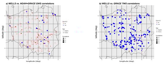 For the area of Poland, the porosity coefficient was estimated, e.g., in []. It obtained similar values in the Vistula and Odra basins (around 0.4). The two basin areas divide Poland into the eastern and western parts, while the different climate zones are rather arranged in latitudinal zones: in the south, there are mountains with more rainfall, in the north, the influence of the Baltic Sea is observed, which causes lower annual temperature amplitudes. To see if these changing climatic and soil conditions can affect the compatibility between the thickness of the unsaturated zone at the location of the well and GWS and the thickness of the unsaturated zone at the location of the well and GRACE, Figure 6 shows the correlations obtained on the area of Poland. Again, it can easily be seen that individual thickness of the unsaturated zone at the location of the well were very weakly correlated with a series of GWS changes, only a few thickness of the unsaturated zone at the location of the thickness of the unsaturated zone at the location of the well obtained correlations greater than 0.2, most thickness of the unsaturated zone at the location of the well have negative correlations (which was also visible in Figure 5). In contrast, compatibility between GRACE and individual wells was at a high level, only single wells have correlations less than 0.2. In both cases, no dependence on the location of the well can be seen. Thus, the local conditions surrounding the individual wells did not explain the lack of compliance (3-month shift) between the average changes in water level in the wells and the GWS series.
