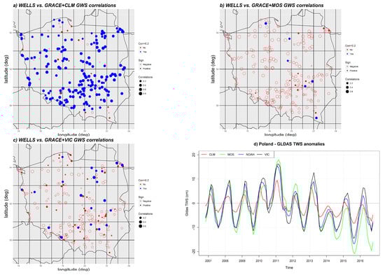 It can be seen in Figure 7 that the GWS results obtained were very different depending on which GLDAS model was used to convert GRACE TWS observations to groundwater head series. For MOS and VIC models, the correlations were very low, mostly negative. For CLM, the correlations were much greater, mostly positive and greater than 0.2. The correlation between GWS calculated from GRACE and CLM averaged over Poland and water level changes in wells, averaged over all wells, was equal to 0.74. It is, therefore, lower than the corresponding correlation coefficient for GRACE itself (see Table 1), but much higher than the correlations obtained based on other models.
