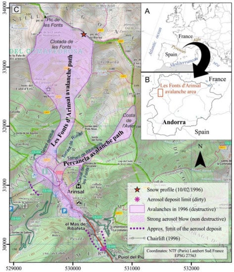 Geographical location of the study area: (A) location of the Pyrenees and Andorra in Europe; (B) location of the area of interest in Andorra; (C) locations of Les Fonts d’Arinsal-Torrent del Ribal (LFd’A) and Percanela-Costa de l’Avier avalanche paths, Arinsal village, the tourist complex and ski resort and the location of the snow profile on 10th February, 1996, marked with a red star.