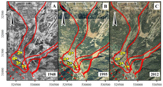 Orthophotographs covering the track and run-out zones of the avalanche paths of LFd’A (west red contour) and Percanela (east red contour) (Coordinates: NFT (Paris) Lambert South France, EPSG 27563). Changes in vegetation in the track zone, especially forest density, can be clearly seen mostly due to avalanche activity: (A) in 1948, after an avalanche that occurred earlier in the decade); (B) in 1995, with the regenerated forest, just before the 1996 avalanche; (C) in 2012, showing the effects of the 1996 avalanche on vegetation. Yellow dots and numbers indicate the approximate run-out of the historical avalanches: (1) the reach of the wet avalanche in the early 1940s; (2) the reach of the avalanche that occurred between the first avalanche and the last one in the 1960s; (3) the minimum run-out of the last avalanche in the 1960s; (4) the reach of the 2015 wet avalanche.