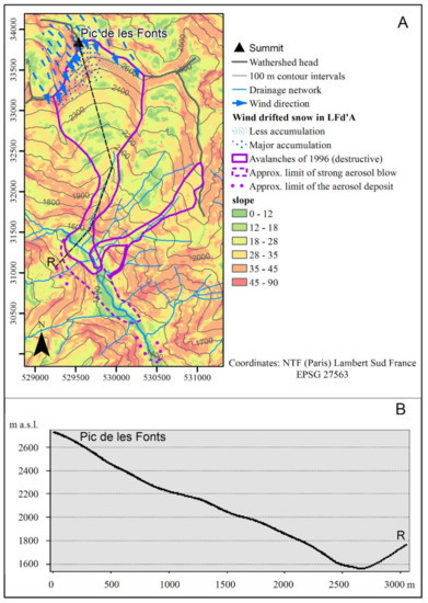 (A) Main wind direction and wind-drifted snow accumulation zones during the snowfall episode in the LFd’A avalanche path on a slope map. (B) Avalanche path profile indicated in (A).