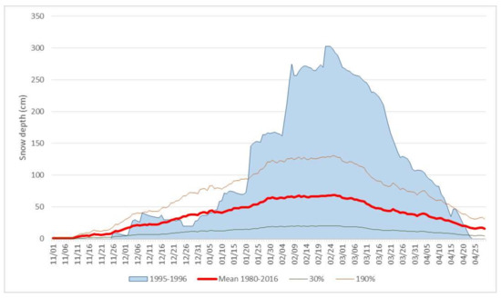Blue polygon shows the daily snow depth (cm) data recorded at the manual weather station in Arinsal ski resort (1927 m a.s.l.) during the winter season, from 1st November 1995 to 30th April 1996. Red, green and brown lines correspond, respectively, to the mean, 30% and 190% values of snow depth (cm) for the 1980–2016 reference period. Gaps in the long-term daily snow depth series have been reconstructed by means of the Safran–Crocus reanalyses generated within the framework of the CLIMPY 2016-2019 project.