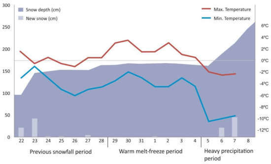 Between 28th January and 4th February, a stable atmosphere predominated over the Iberian Peninsula with relative anticyclonic conditions and weak geopotential gradient at high levels. This circulation pattern favoured weak SSE winds and the advection of a warm air mass up to the northern part of the Pyrenees. This winter period was characterized by mostly sunny days and mild temperatures. At high altitudes, above 1900 m a.s.l., temperatures reached positive values during sunlight hours, facilitating the snow melt, while subzero temperatures during the night froze the previously melted snow [4,13], as shown by the atmospheric weather observations at the Arinsal ski resort (Figure 5). This persistent melt–freeze process gave rise to the formation of a melt–freeze crust. During the events of 8th February, the crust acted as a bed surface of the avalanches in Costa de l’Avier-Percanela and in Clotada de Les Fonts-LFd’A cirque.