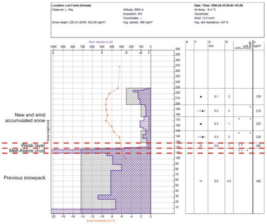 On 10th February, two days after the LFd’A avalanche, a snow profile was made by L. Rey and M. Baró (Figure 6) close to and above the crown scar, at 2650 m a.s.l., on a south-west facing slope (Figure 1 and Figure 3). The snow thickness above the crust was 1.10 m and the snowpack temperatures ranged from −5.1 °C to −9.1 °C, after two days’ settlement. It was composed of a fine layer of a few centimetres of faceted grains, which might have formed either during the first episode, when a distinct temperature gradient generated near the crust might have produced a thin layer of near-surface faceted crystals, or during the beginning of the second episode, when the newly fallen snow might have been transformed due to the temperature gradient among the crust and the low atmospheric temperatures. Above this layer, there were rounded grains with some wind-broken and partly decomposed precipitation particles, with densities ranging from 210 kg/m3 to 370 kg/m3. In summary, a snowpack thicker than 1 m of cold, new, wind-accumulated snow was lying on top of a weak layer of poorly bonded, faceted crystals, which in turn was lying over the melt–freeze crust developed during the previous warm period. Furthermore, it has to be pointed out that the slopes were covered with new snow right to the bottom of the valley (Figure 7 and Figure 8), thus favouring the entrainment of snow all along the avalanche descent and feeding it.