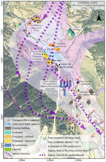 The destructive avalanche flow affected an area of about 16 ha in the run-out, but the area affected by the strong, non-destructive aerosol blow went 1 km further downstream into the main valley (Figure 1). At about 1600 m a.s.l., at the beginning of the run-out zone where the slope angle abruptly decreases (Figure 3), the avalanche plastered the dirt snow against the snowpack and ground, leaving a very hard deposit of snow, earth and vegetation fragments, all less than 1 m thick (Figure 7, Figure 8 and Figure 9, Table 1 and Figure 10i,j,o,p) and with a roughly estimated mass of <50 × 106 m3. This deposit represents between 10% and 15% of the avalanche mass. Locally, where the slopes present a greater leeward inclination, the snow was not plastered but entrained (Figure 9 and Figure 10o,p). Between the Amadeus and Prat Sobirans buildings (Figure 9), the trees growing along the road and protruding over it were trimmed by the blow at the slope roadside height. At the valley bottom, the compact dirt snow deposit locally reached a maximum thickness of 6 m (Figure 9). A few days later, Dr. J. Becat mapped the avalanche and distinguished two zones: one with major destruction and deposits, and the other with evidence of shock wave and strong blow. His map is reproduced in [8]. The outer and inner limits of this map, modified and improved as shown in the Avalanche Cadastre of Andorra [16], are replicated here (Figure 1 and Figure 9). It is confirmed that the inner limit corresponds to the zone with major damage, including forest destruction (Figure 8B) and the very hard deposits of plastered snow on the ground, and the outer limit corresponds to the area affected by the aerosol blow which threw people to the ground, displaced parked cars and also plastered up to 0.2 m of snow on the facades of the houses oriented upstream along the valley towards Arinsal [8], with snow that was not plastered on the ground but just deposited as snowfall. However, faint deposits of dirt snow, pine needles and small fragments of branches were found as far away as the Sant Gothard hotel, about 1750 m downstream the Arinsal valley and small pieces of furniture and appliances up to half way to the ski resort chairlift line (Figure 1). The main damage, as described below, and the referenced buildings and locations are summarised in Figure 9 and Figure 10. Figures S2–S9 in the Supplementary Materials show several pictures taken from a helicopter.