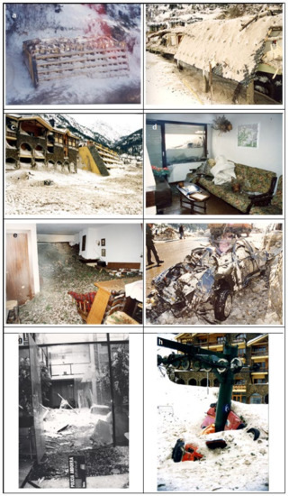 Eight of the eleven evacuated buildings were affected, to differing degrees (Figure 9). The hundreds of transported trees acted as battering rams [2]. The avalanche passed over the Amadeus apartment buildings, whose roofs had been designed and built as avalanche galleries [2] (Figure 10o,p). It caused minor damage to protruding ornamental features but produced a depression effect downwards: the windows were opened outwards (rather than inwards) and the curtains were found hanging outside; the snow entered and reached the second floor via the staircase [14].