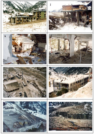 At the right margin of the run-out, the Prat Sobirans buildings were also hit (Figure 9). The worst affected was the six-floor block D, where the avalanche completely destroyed the two floors closest to the ground level, resulting in structural damage to the supporting pillars (Figure 10i,j,l) [15]. The avalanche entered and exited the building through the brick walls which did not resist (Figure 10i,j,l); however, some stone clad walls, not perpendicular to the flow, did resist [2,15]. Part of the roof was also destroyed (Figure 10i,k). Damaged household appliances and pieces of furniture were found up to the run-up at the opposite slope (Figure 9). Later, only the two lower floors were reconstructed, as they are below ground level and are protected by a new dike. In block C the doors and windows were destroyed, and the partitions fell (Figure 10i,m); in blocks A and B, there was only non-significant external damage to decorative features.