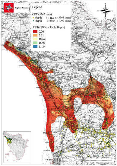 Furthermore, the Tuscany region and the Department of Civil and Industrial Engineering of Pisa University have recovered further cone penetration tests from engineers and geologists working in this territory. However, it was not possible to find boreholes and undisturbed sampling close to each cone penetration test. Since the groundwater table (GWT) level was rarely available in the CPT test reports, the Tuscany region carried out an ad-hoc study to infer the water table depth from the piezometric surface, which was available for almost the entire study area. The latter was inferred by the phreatimetric studies carried out by the Basin Authorities of the Arno and Serchio rivers (Figure 1). It is important to stress that the water table depth in the whole study area was accurately identified. Indeed, water table is an important parameter. The considered values represent the average depth after considering the seasonal variations. Considering that the seismic risk in Italy is assessed by a probabilistic approach (NTC, 2018 [46]), the average value of the water table depth seems an acceptable assumption for a study covering an area of about 1800 square km. Most of the CPT data were not in a digital format or on a digital support, thus it was necessary to digitize the collected data. The above-mentioned databases consisted of 5362 CPTs. It was possible to convert only 4500 CPTm and 16 CPTu to a digital format. These data represent the available geo-referenced database. Table 1, Table 2 and Table 3 summarize, for each macro-area in which the study territory was divided, the number of available CPT tests (CPTm and CPTu), and the maximum depth attained during the tests.