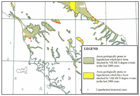 Areas geologically prone to liquefaction in the study area (adapted from Galli and Meloni [47]).