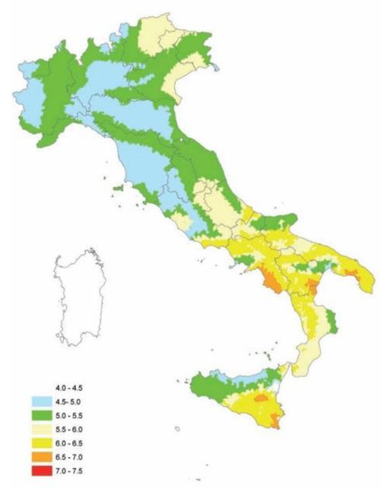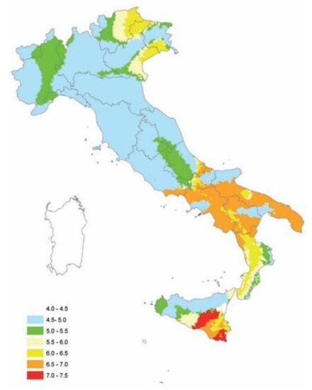 The amplification factor ST was assumed equal to 1, thus considering the topographic area as flat. The factor SS was inferred from the Italian Building Code [46], assuming a ground type C, which means a stratigraphic profile characterized by an average shear wave velocity of the first 30 m between 180 and 360 m/s. Table 4 shows the values of the free-field peak ground acceleration (as) at each municipality considered in this study. The moment magnitude MW (necessary for determining the magnitude scaling factor (MSF)) was first determined by the disaggregation of the seismic hazard for a return period of 475 years [52]. For all the municipalities in the study area, the modal values of MW (from disaggregation) are between 4.5 and 5.0 (Figure 3). On the other hand, the average values of MW (Figure 4) for some municipalities are between 4.5 and 5.0, while for others they were between 5.0 and 5.5. For simplicity, it was decided to use a unique value, MW = 5.5 (corresponding to the upper limit), for all the municipalities of the study area. From a theoretical point of view, the assumption of a unique value of magnitude means considering a single-scenario earthquake. From a practical point of view, such an assumption is responsible, in some municipalities, for a negligible underestimation of the safety factor (less than 8%). It is worth mentioning that the moment magnitude affects the MSF. Indeed, the earthquake duration (i.e., the number of cycles of equivalent amplitude) increases with the magnitude, which in turn influences the CRR (i.e., the factor of safety against liquefaction). The factor of safety increases as magnitude (MW) decreases.