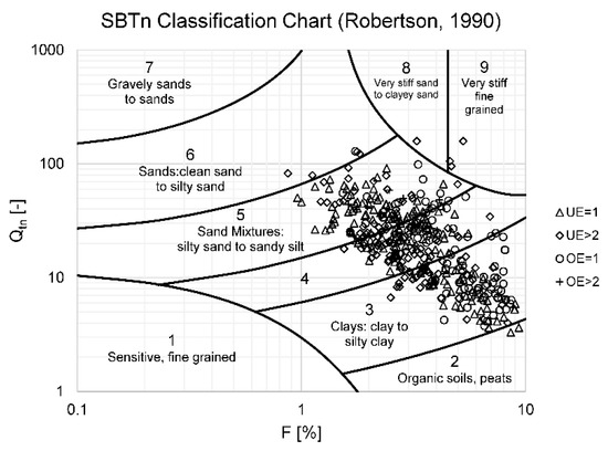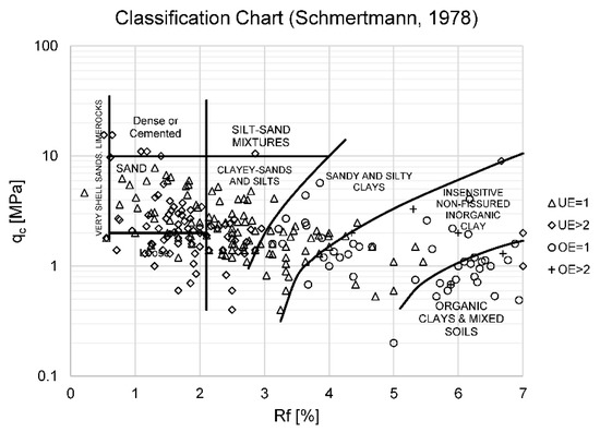 Figure 6 clearly shows that the SBTn class 6 has a limited number of cases, while classes 7 and/or 8 are completely absent. On the contrary, the Schmertmann chart [56] exhibits a relevant number of points in the sand and silt/sand areas (Figure 7).