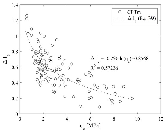 The necessary correction factor, ΔIC, to have a correct match between the two classification systems (Table 5) was thus defined. The proposed correction applies only when the Robertson [38] classification underestimates that of Schmertmann [56] (Equation (38)):