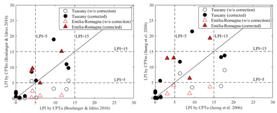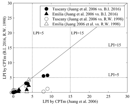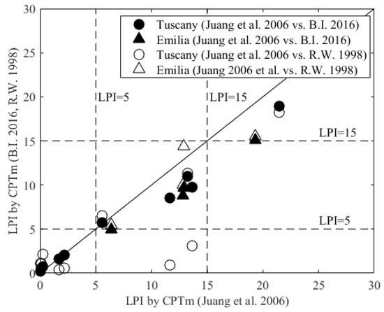 - in any case, the Robertson and Wride [16] approach leads to a conservative estimate of LPI, whereas the Boulanger and Idriss [24] and Juang et al. [19] approaches lead to less conservative LPI estimates. Nevertheless, the estimates obtained by using the Boulanger and Idriss [24] and Juang et al. [19] methods are closer to those obtained from CPTu tests, at least for the CPTm-CPTu pairs compared herein.