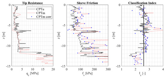 The corrected value of IC is only used for improving the soil classification (SBTn), thus it is not applied to Equations (11), (12), (22), and (29)–(31) in which the uncorrected value is still considered. In fact, the use of the SBTn classification system [16,38,39], which is based on CPTu, for the interpretation of CPTm leads on several occasions to an underestimation of the soil grain size, which in turn means an overestimation of IC.
