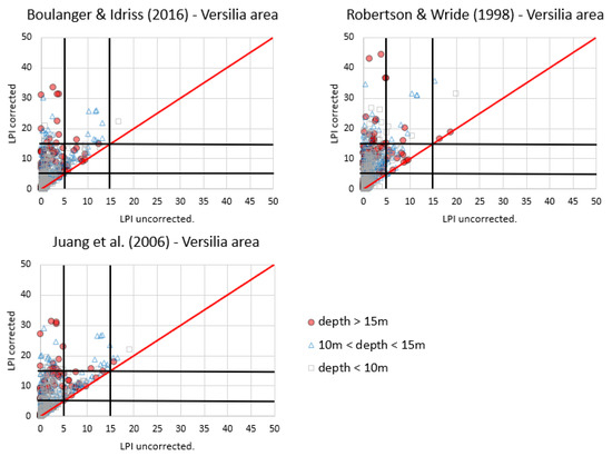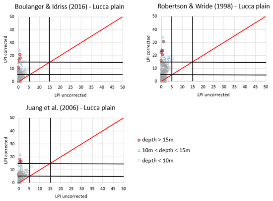 - for the Versilia macro-area (Table 7, Figure 15), where most of the available tests were carried out down to depths of 5–8 m (31%) and 8–10 m (24%), the three LEPs without applying the fs and Ic corrections agree to recognize a zero or low severity for most of the tests. After applying the corrections described in Section 4.3 to the Robertson and Wride [16] method, the high severity and very high severity classes increase from 11.9% and 2.0% to about 45.5% and 20.8%, respectively (considering only those tests with depths equal to or higher than 15 m). When the corrections are applied to the Boulanger and Idriss [24] and Juang et al. [19] approaches, the increase in the high and very high severity classes is less dramatic, especially for the very high severity class (LPI > 15);