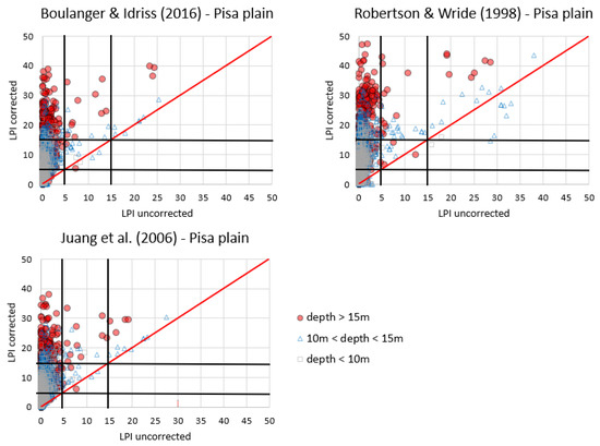 The IC correction is only intended to improve the identification of potentially liquefiable layers, i.e., those layers having an IC less than the IC cut-off value. The latter value (IC cut-off) is used to screen out clay-like soils and is commonly taken between 2.4 and 2.6 [24]. It is worthwhile to remember that those layers with IC higher than IC cut-off are assumed to be non-liquefiable, thus are not considered in the computation of the LPI.