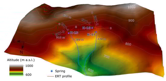 Surveys were conducted using the Wenner–Schlumberger array and the Wenner array (ERT-3 and ERT-4) at a frequency of 1.8 Hz and a maximum phase of 20° between the voltage signal and the current signal. Figure 2 shows positions of four profiles and positions of springs. The first profile (ERT-1) was measured with 64 steel electrodes; the length of the profile was 630 m, with an exploration depth of about 100 m. Profile ERT-2 was measured with 48 electrodes; the length of the profile was 470 m, with an exploration depth of about 75 m. Profile ERT-3 and ERT-4 were measured with 32 electrodes; the lengths of the profiles were both 310 m, with an exploration depth of about 50 m.