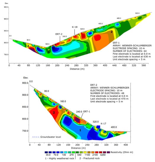 Profiles ERT-1 (RMS = 17.2%) and ERT-2 (RMS = 19.2%) had relatively high RMS errors due to several reasons. The profile ERT-1 was placed on the V shaped terrain (Figure 3), which can produce terrain-induced noise in the data. This could not be avoided because of the position of the K-17 spring, which was very close to the valley (Figure 2). The profile ERT-2 was placed on a very steep mountain slope (Figure 3), which can also increase errors in the data. Previously-mentioned contact impedance of the electrodes was relatively high in some parts of the profiles (up to 4 kΩ), due to high resistance of the ground surface. This was a consequence of very rocky ground in some parts of the profiles and resulted in quite noisy data. Figure 3 shows inverted resistivity cross-sections ERT-1 (iteration 4) and ERT-2 (iteration 5) after removing bad data points from the measured data set. Taking into account the objective obstacles during data acquisition caused by the hard terrain, the results are considered satisfying. The resulting resistivity ranged from approximately 20 to 10,000 Ωm. Zones of different resistivity did not show significant changes with depth, rather horizontal changes. The zone of lower resistivity (20–200 Ωm) was located beneath and in the close hinterland of the K-17 spring (Figure 3) and it was in vertical contact with a zone of higher resistivity (up to 2000 Ωm) in the upper parts of the profiles.