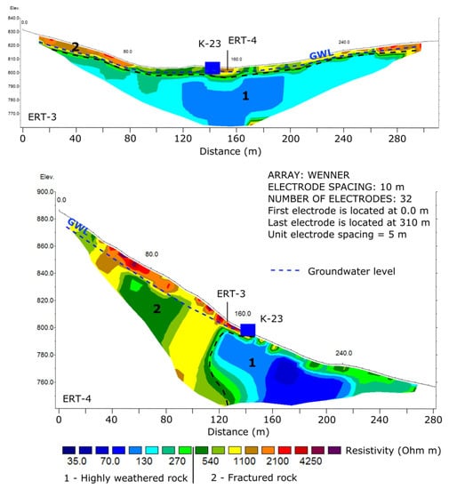 Figure 4 shows inverted resistivity cross-sections ERT-3 (iteration 6) and ERT-4 (iteration 5) after removing bad data points from the measured data set. These two profiles were measured with both the Wenner–Schlumberger and Wenner array. The Wenner array proved to be more applicable under the given conditions, resulting in fewer errors in the data. However, the resulting inverted resistivity cross-sections showed very similar resistivity distributions with both arrays. Profile ERT-3 had RMS = 3.9% and ERT-4 had RMS = 9.7%, which is below 10%. Higher RMS for ERT-4 can be caused by higher contact impedance of the electrodes in the upper parts of the profile, due to high resistance of the ground surface. The resulting resistivity profile ERT-4 showed a similar situation as profile ERT-2. Zones of different resistivity also did not show significant changes with depth, rather lateral changes. The zone of lower resistivity (20–200 Ωm) was located beneath the K-23 spring (Figure 4) and it was in vertical contact with the zone of higher resistivity (up to 1000 Ωm) in the upper part of the profile. There was an increase of resistivity in the shallow subsurface zone on the slope above the K-23 spring. Profile ERT-3 was located close to the contact of the two different resistivity zones and it did not show significant horizontal changes in resistivity.
