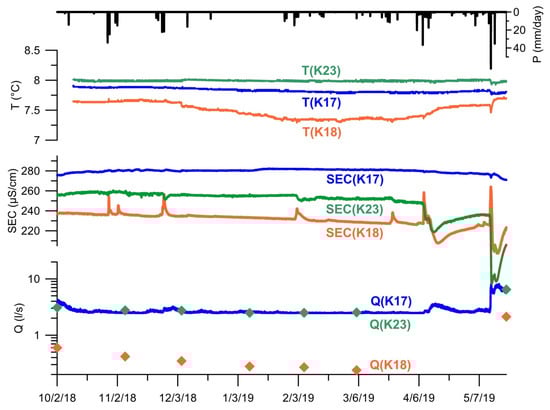 Discharge (Q), temperature (T), specific electrical conductivity (SEC), and precipitation (P) data for K17, K18, and K23 springs (discharge in logarithmic scale).