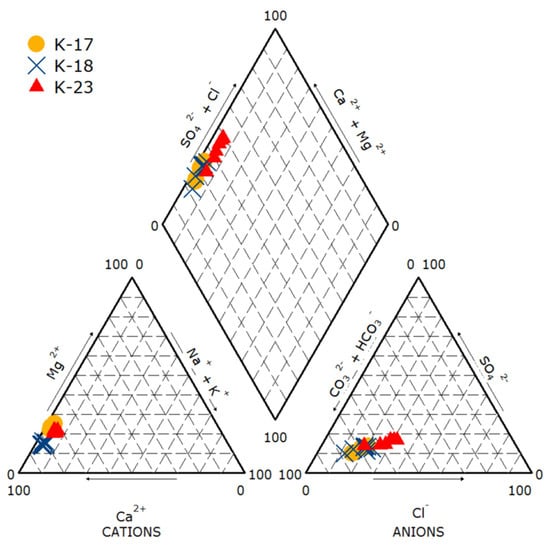 In order to define spring water hydrochemical facies, all the results of the principal anion and cation analyses were plotted on a Piper diagram (Figure 6). All the water samples from all three monitored springs belonged to the calcium-bicarbonate water type. In some samples, mainly from the K23 spring, chloride ions were also present in considerable amounts. Additionally, chlorides were the only major ion component that showed moderately variable content, while all other ion contents were very stable. Spring water mineralization ranged approximately by 190–200 mg/L on K17, 145–175 mg/L on K23, and 150–170 mg/L on K18. TOC content was very low in all spring water samples (<0.2 mg/L).