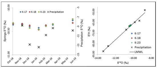 Stable isotope composition of the spring water and precipitation. (Left): changes of δ18O in time; (Right): composition of δ2H and δ18O for all samples and the local meteoric water line (LMWL).