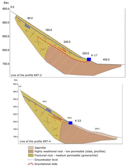Greenschists were found to be more resistant to weathering than slates and phyllites by surficial mapping. Greenschists are generally characterized by fracture porosity, probably enhanced by alteration processes []. Phyllites and slates, observable on the surface only in intensely eroded stream gullies, are more prone to intensive weathering and saprolite accumulation on the surface. Contact of less weathered rocks with intensely weathered rocks, mostly covered by a saprolite layer, were marked in terrain morphology by transitions from steeper to gentler slopes. Major springs of the Jelenske vode area were situated on such transitions, with greenschist rocks exposed on the surface of slopes above them and mostly saprolite-covered terrain below them. According to the spring positions, as well as measured ERT profiles, highly weathered rock masses form relative barriers for underground fracture flow, which raised the groundwater level to the surface and caused the formation of springs (Figure 8). Both major springs of Jelenske vode, K17 and K23, were located at, or close to, the transition from medium-high to low resistivity zones on the ERT profiles (Figure 3 and Figure 4). On the K17 location, highly weathered rock mass was overlain by approximately 20 m of less weathered rocks, with the spring located at the base of less weathered layer. Higher resistivity rocks lying on top of low resistivity rocks in the immediate hinterland of K17 was interpreted as gravitational sliding of harder greenschist blocks on highly weathered rocks below (Figure 8). The K23 spring was located at the steep contact of less weathered rock above and highly weathered rock mass below (Figure 8). Increase of resistivity in the shallow subsurface zone (several meters thick) on the upper parts of both profiles (Figure 3, Figure 4 and Figure 8) was attributed to the depth of groundwater level in the fractured rock mass. A similar significant contrast in specific resistivity between the unsaturated and saturated zone has been noticed by other studies on hard-rock aquifers [,,].