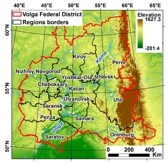 The Volga Federal District is located in the East of the Russian Plain in the Volga and Kama River basins and partially covers the Urals (Figure 1). The area of the district is about 1,038,000 km2. The district covers several landscape zones: the taiga zone, the zone of mixed and broad-leaved forests, the forest-steppe zone, the steppe zone, and the mountain landscapes of the Urals.