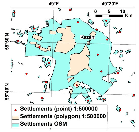 For cities and other large settlements (including rural settlements with a population of more than 10 thousand inhabitants), the population was specified and updated according to the 2010 All-Russian Population Census [30]. OpenStreetMap maps updated for 2016 were used as an additional source of information. The need to use these data is due to two reasons. Larger scale and high detail allowed the transfer of population information from a large number of point features from a 1:1,000,000 map to the OSM polygonal settlements. The geometry of polygonal settlements was also updated. This necessity was caused by the different scales of maps. Furthermore, it connected with a real change in borders due to the increase in the area of most settlements since the topographic map was created. So, for example, the modern territory of Kazan has grown significantly, incorporating several nearby villages. In such cases, the total population of all settlements lying within modern borders was summarized (Figure 2).
