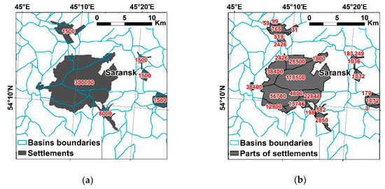Calculation of the population in parts of settlements located in the different basins: (a) population in settlements; (b) population in the parts of settlements belonging to the different basins.