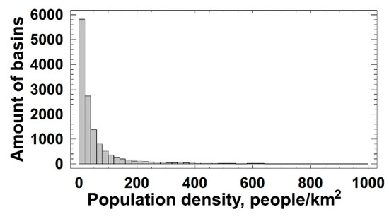 For further calculation of the anthropogenic pressure, the population density indicator must be converted to a dimensionless form with a range of values from 0 to 1. For this, the basins with a population density ≥1000 people/km2 were assigned the maximum value of 1. For other basins, the indicator was normalized using the formula: