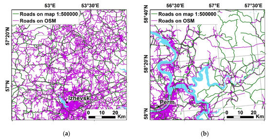 Another indicator characterizing the degree of anthropogenic pressure on the territory is the density of the road network. This indicator, being part of the infrastructure, indirectly reflects the degree of industrial development. To calculate the density of the road network in the basins, 2 data sources were used. The first was a layer of roads digitized from topographic maps of Russia on a scale of 1:500,000. The second was OpenStreetMap data. Both road and railway layers were processed. The use of information from the two sources was due to several reasons. On the one hand, the data on topographic maps are outdated: since the moment of their compilation, a large number of new roads have been constructed, and repair or reconstruction of existing ones has been carried out (i.e., the road surface, the width of the road, or the entire category of the road could be changed). Additionally, OSM data are more detailed due to the larger scale (approximately 1:100,000) (Figure 6a). On the other hand, OSM data may be incomplete, because it was created by the open community, and work on the project is not yet complete (Figure 6b).