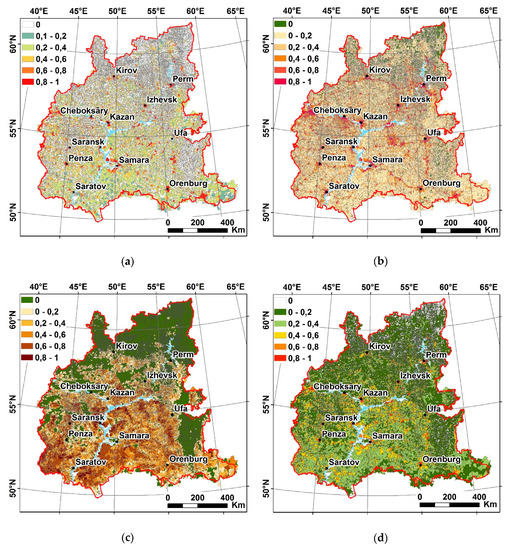 Maps of particular and integral indicators of anthropogenic pressure in the river basins of the Volga Federal District: (a) the normalized indicator of population density, (b) the normalized indicator of the density of the road network, (c) cropland fraction in the river basins, (d) integral indicator of anthropogenic pressure in the river basins.