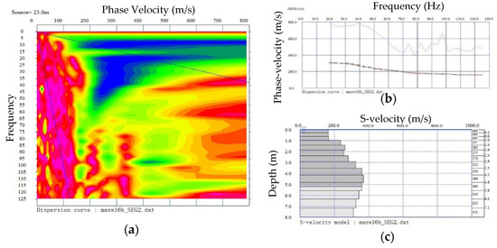 We calculated the VS profiles using the multichannel analysis of surface waves (MASW), originally introduced by Park et al. [23,24]. This method is still being developed and has been used in several areas [25,26,27]. By using f-v stack, the variation of MASW acquisition geometries to provide f-v stack from recorded traces data in space-time (x-t) and frequency-phase velocity (f-v) domain. Identical equipment was used to analyze MASW and seismic refraction: we used the Doremi Seismograph (SARA Instrument) with 24 geophone channels in two wire line cables. This measurement applied the same procedure as the geoelectricity array. MASW data were acquired using eight 4.5 Hz geophones recorded with an own-constructed data logger. The data record was set to 7200 data for 24 channels per second, and geophone spacing was set to 0.5 m. An example of measured MASW data is obtained at point line 2, especially at four-shot gathers recorded with the source at 3-m offset. These shot gathers were then Butterworth bandpass filtered (3~45 Hz), especially for removing the power frequency of 50 Hz, which dominantly influenced the data (see Figure 1a). The data were then collected from f-v, via remapping them in f-k (frequency–wavenumber) domain, (see Figure 1b). In the f-v domain, all shots appeared to be consistent for each data set. The f-v diagrams in Figure 1, b were then stacked manually to improve the quality of data and suppress the inconsistent noise closures (see Figure 2a). By using this f-v data stack, we easily collected the data and ran it through the program to compute interpolation and smoothing values. The selected data was then automatically inverted using the SeisImager module (WaveEq) to produce the VS profile (see Figure 2b).