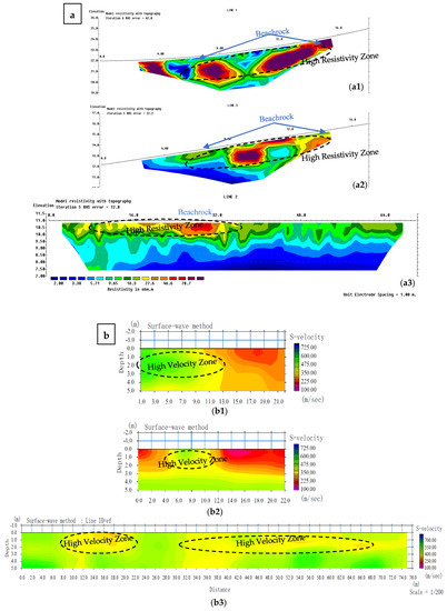 Figure 3 shows the apparent resistivity distribution of each survey line, as indicated by the electric survey method. As a general trend, the apparent resistivity at 1 m in the shallow layer was slightly high (9.65 to 16.3 Ωm), and a section of the surface layer of the α-section had the highest resistivity (46.7 to 78.7 Ωm). Below this level was a low resistivity layer of 1 to 5 Ωm. The beachrock sedimentary value of the β-section was 9.65 to 16.3 Ωm, with the highest being 46.7 to 78.7 Ωm. Furthermore, when the depth exceeded 4 m, the apparent specific resistance tended to increase gradually. The MASW method adopts the conventional linear receiver array and mainly attempts to use the surface waves generated from natural beachrock. This method uses the passive remote method to overcome limitations, such as the inconvenience in field operations, by foregoing the accuracy (usually less than 10%) of the VS evaluation and dominance of noise data. In this method, the array can be set along a shoreline, and the survey can continue in a roll-along mode for the purpose of two-dimension VS profiling. Using a land streamer for the array can improve survey speed by as much as a few orders of magnitude. In addition, an active impact (e.g., using a sledgehammer) can be applied at one end of the array to trigger a long recording (e.g., 60 s). This can result in a combined active–passive analysis of surface waves to obtain both shallow (e.g., 1–20 m) and deep (e.g., 20–100 m) VS information simultaneously (Figure 3). As a general trend, the S-velocity on the wavelength side was 300 to 600 m/s, but on the longer side of the wavelength, the phase velocity increased to 400-550 m/s. For each survey line, a band of 10 to 100 Hz was analyzed in the dispersion curve. Figure 3(a1–a3) show the resistivity cross-sections of each survey line when, on the other hand, Figure 3(b1–b3) show the S-wave velocity cross-sections. In general, both cross-sectional views were well aligned, with a surface resistivity of approximately 1 m, a slightly higher resistivity layer, a lower resistivity layer, and a lower portion. It had a three-layer structure with a high resistivity layer (high-speed layer). In other words, there was a slightly higher velocity layer of 300 to 350 m/s on the surface layer where the distance between line-1 and line-3 from 0 to 3 m, which was the beachrock outcrop, was exposed on the surface, and the distance of line-2 was 0 to 2 m on the α-section.