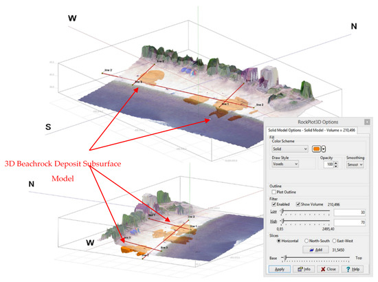 The concept of 3D processing entails a combination of processing each line via the drone photogrammetric technique and overlaying digital elevation model data using ArcGis. The distance between lines was interpolated with the lines around it. The data input applied in 3-D modeling had four parameters, namely x, y, z, and n. Coordinates in UTM were labelled as x and y, indicating the position of the north and east meters. The value of z as an elevation parameter is not depth because it follows the digital elevation model of topography and geophysics parameters, such as resistivity and surface wave values. This model used ArcGis and Rock Work to calculate the distribution of beachrock in the Krakal–Sadranan beach, Yogyakarta. The limitation of the value of resistivity and S-velocity taken also applied between 9–78.7 Ωm and an S-velocity value between 400–600 m/sec. Based on the calculation, the α-section covered 210.496 m3 of beachrock (Figure 4), while the β-section covered 76.936 m3 (Supplement Material Figure S5).